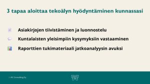 Tekoälyn hyödyntämisessä tärkeintä on aloittaa pienillä, konkreettisilla askelilla. Moni kunta ja virasto saa jo nyt nopeasti hyötyjä ilman raskaita IT-investointeja. 👉 Tässä kolme käytännön esimerkkiä:1️⃣ Asiakirjojen tiivistäminen ja luonnostelu – AI auttaa asiantuntijoita ja säästää aikaa usein toistuvissa kirjoitustehtävissä.2️⃣ Asukkaiden yleisimpiin kysymyksiin vastaaminen – chatbotit ja tukityökalut asiakaspalvelun tukena.3️⃣ Raporttien alustava, lisä-, ja täydentävä materiaali…